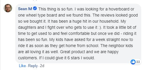 "This thing is so fun. I was looking for a hoverboard or one wheel type board and we found this. The reviews looked good so we bought it. It has been a huge hit in our household. My daughters and I fight over who gets to use it :). It took a little bit of time to get used to and feel comfortable but once we did - riding it has been so fun. My kids have asked for a week straight now to ride it as soon as they get home from school. The neighbor kids are all loving it as well. Great product and we are happy customers. If I could give it 6 stars I would."