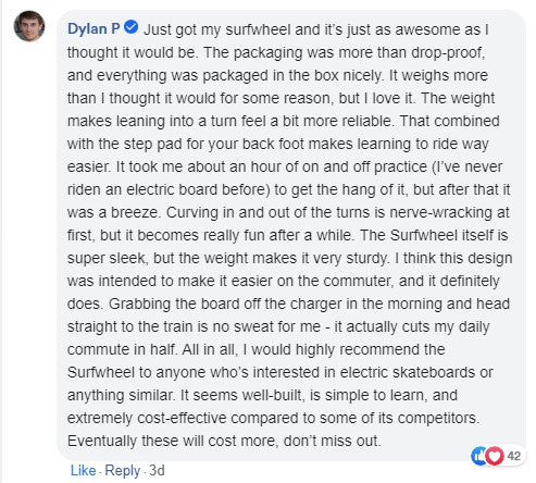 "Just got my surfwheel and it’s just as awesome as I thought it would be. The packaging was more than drop-proof, and everything was packaged in the box nicely. It weighs more than I thought it would for some reason, but I love it. The weight makes leaning into a turn feel a bit more reliable. That combined with the step pad for your back foot makes learning to ride way easier. It took me about an hour of on and off practice (I’ve never riden an electric board before) to get the hang of it, but after that it was a breeze. Curving in and out of the turns is nerve-wracking at first, but it becomes really fun after a while. The Surfwheel itself is super sleek, but the weight makes it very sturdy. I think this design was intended to make it easier on the commuter, and it definitely does. Grabbing the board off the charger in the morning and head straight to the train is no sweat for me - it actually cuts my daily commute in half. All in all, I would highly recommend the Surfwheel to anyone who’s interested in electric skateboards or anything similar. It seems well-built, is simple to learn, and extremely cost-effective compared to some of its competitors. Eventually these will cost more, don’t miss out."