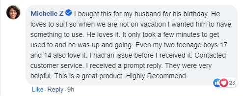 "I bought this for my husband for his birthday. He loves to surf so when we are not on vacation I wanted him to have something to use. He loves it. It only took a few minutes to get used to and he was up and going. Even my two teenage boys 17 and 14 also love it. I had an issue before I received it. Contacted customer service. I received a prompt reply. They were very helpful. This is a great product. Highly Recommend."